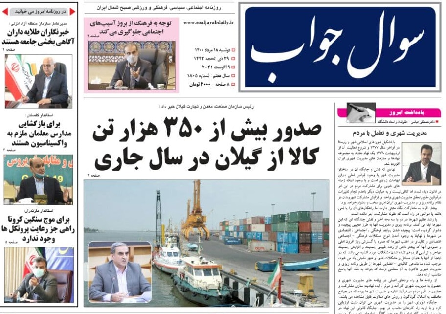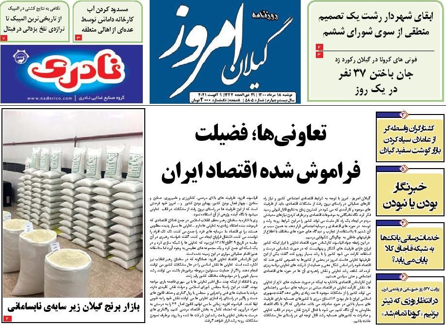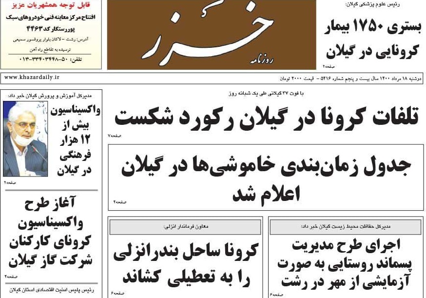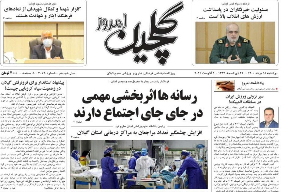 «با فوت 27 گیلانی طی یک شبانه روز گذشته؛ تلفات کرونا در گیلان رکورد شکست»، «فرماندار رشت در دیدار با مدیر کل صدا و سیمای گیلان؛ رسانه ها اثر بخشی مهمی در جای جای اجتماع دارند»، «رئیس سازمان صنعت، معدن و تجارت گیلان خبر داد: صدور بیش از 350 هزار تن کالا از گیلان در سال جاری»و «تعاونی ها؛ فضیلت فراموش شده اقتصاد ایران» از عناوین روزنامه‌های امروز (18مرداد) استان گیلان است.