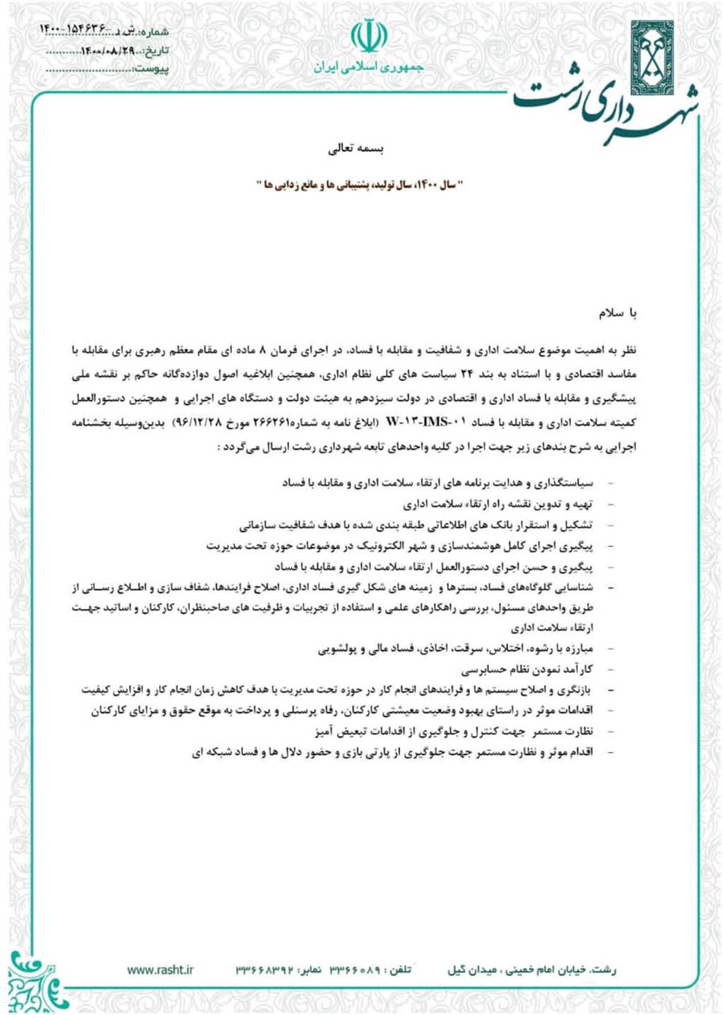 شهردار رشت در همین راستا با بیان اینکه مبارزه با فساد از سرفصلهای مهم برنامه ارائه شده وی به شورای اسلامی شهر رشت بوده است، عنوان کرد: بدون شک بیتوجهی به فرمان ۸ مادهای مقام معظم رهبری هزینههای زیادی را به بخشهای مختلف کشور تحمیل کرده است. بنابراین باید از یکجا جلوی خسارتها گرفته و امکان شفافیت و سلامت اداری فراهم شود.