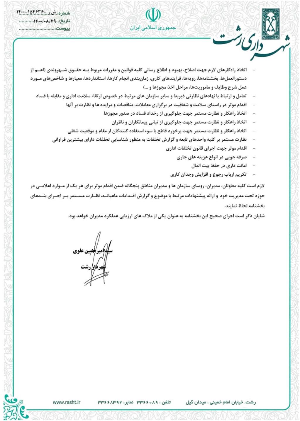 علوی، سیاست گذاری در حوزه ارتقای سلامت اداری و مقابله با فساد، پیگیری اجرای کامل هوشمندسازی، شناسایی گلوگاههای فساد، کارآمد نمودن نظام حسابرسی، کنترل و جلوگیری از اقدامات تبعیض آمیز، ارتباط با نهادهای نظارتی و سازمانهای مرتبط در ارتقای سلامت اداری و مقابله با فساد، اقدام موثر در راستای سلامت و شفافیت در برگزاری معاملات، مناقصات و مزایده ها، جلوگیری از فساد در صدور مجوزها، برخورد قاطع با سوء استفاده کنندگان از مقام و موقعیت شغلی، صرفه جویی و ساده زیستی، امانتداری در حفظ بیت المال، تکریم ارباب رجوع و افزایش وجدان کاری از مهمترین بندهای بخشنامه سلامت اداری، شفافیت و مقابله با فساد شهردار رشت محسوب میشود.