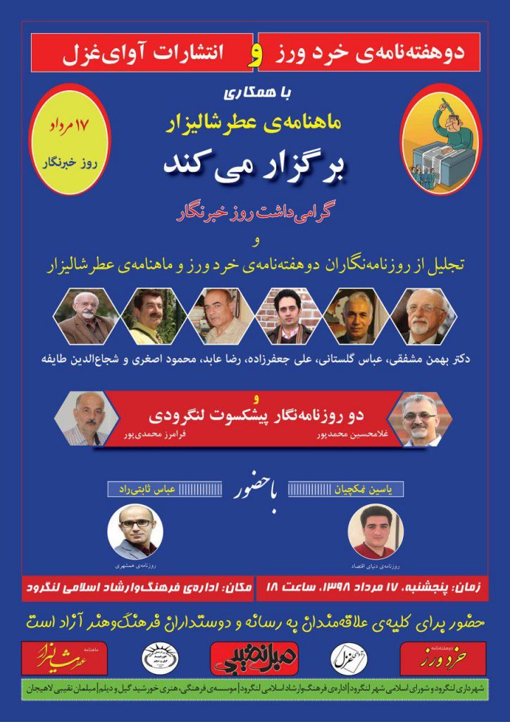 مراسم گرامیداشت روز خبرنگار و تجلیل از روزنامهنگاران دوهفتهنامه خردورز و ماهنامه عطر شالیزار با حضور اصحاب رسانه از ساعت ۱۸ روز پنجشنبه، ۱۷ مرداد ۱۳۹۸ در اداره فرهنگ و ارشاد اسلامی لنگرود برگزار میشود.