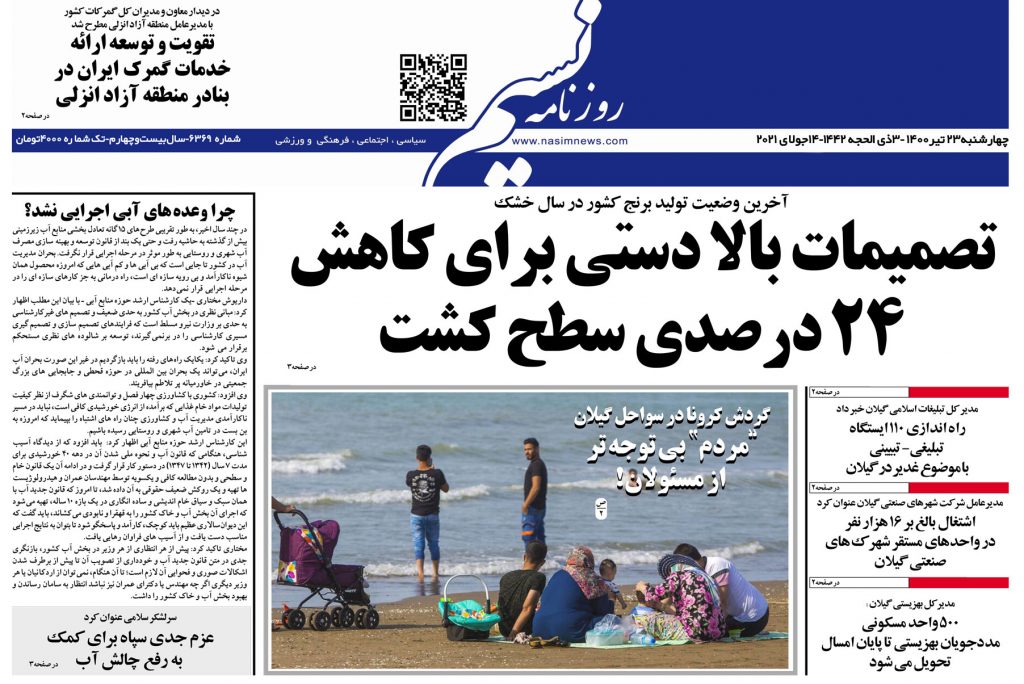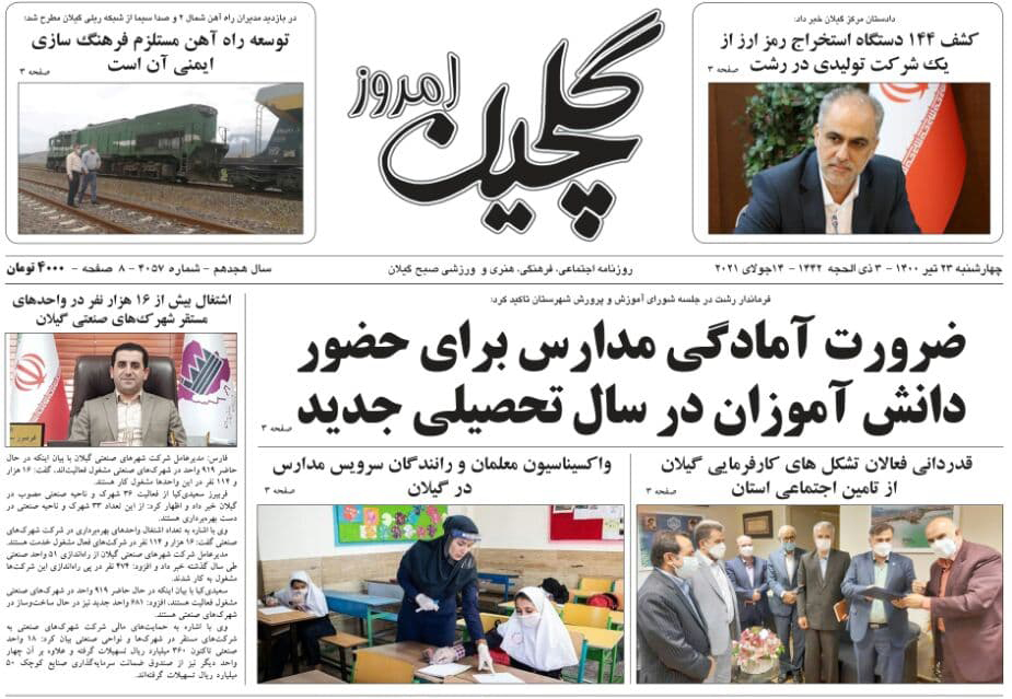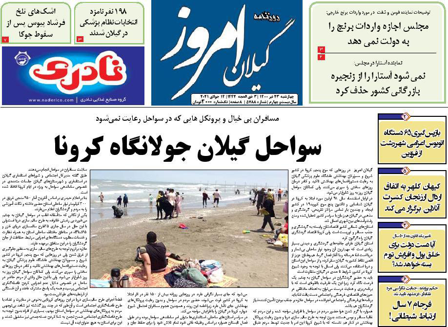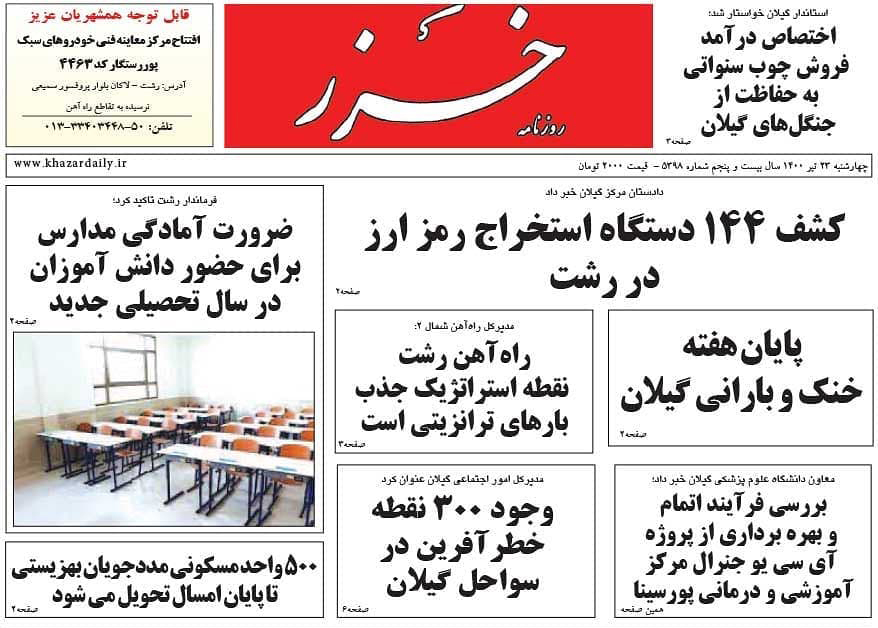 «سواحل گیلان جولانگاه کرونا»، «ضرورت آمادگی مدارس برای حضور دانش آموزان در سال تحصیلی جدید»، «کشف 144 دستگاه استخراج رمز ارز در رشت» و «مستاجران، رها در توفان بازار اجاره»، «تصمیمات بالادستی برای کاهش 24 درصدی سطح کشت» و «شهر رشت تشنه خدمت است» از عناوین روزنامههای امروز (23 تیر) استان گیلان است.