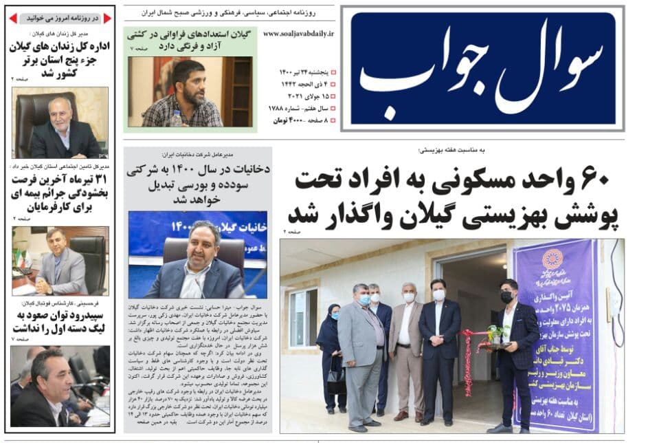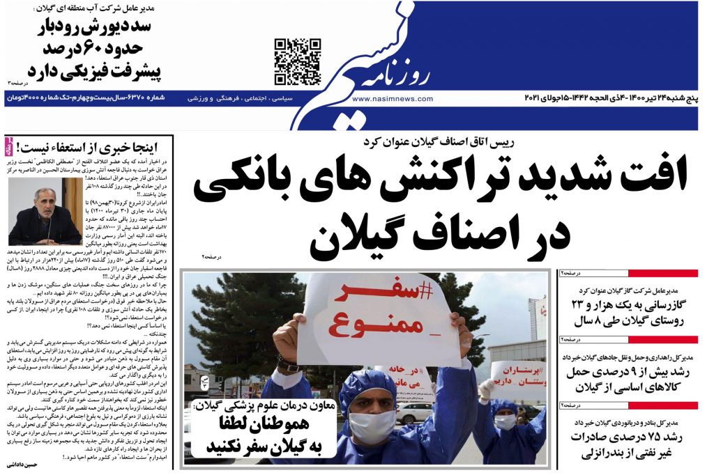 «تعطیلیها فقط باعث آسیب جدی به اصناف میشود»، «افت شدید تراکنشهای مالی در اصناف گیلان»، «اینجا خبری از استعفا نیست» و «60 واحد مسکونی به افراد تحت پوشش بهزیستی گیلان واگذار شد» از عناوین روزنامههای امروز (24 تیر) استان گیلان است.