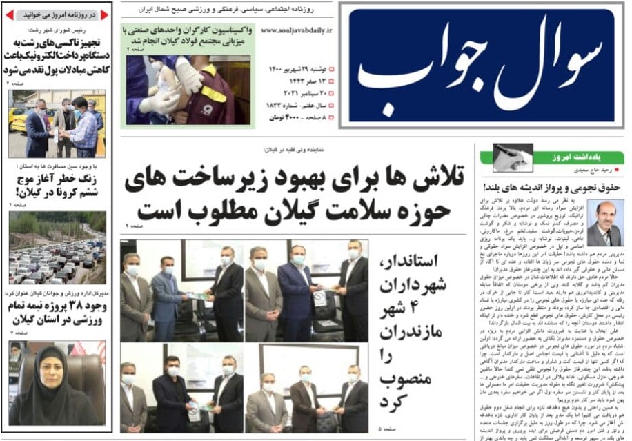 «رئیس شورای شهر رشت مطرح کرد؛ مشکلات زیست محیطی دفع غیر اصولی فاضلاب در برخی محلات رشت»، «نماینده ولی فقیه در گیلان: تلاش‌ها برای بهبود زیر ساخت‌های حوزه سلامت گیلان مطلوب است»و «شوک ارز 4200 تومانی به اقتصاد کشور... کالاها به قیمت ارز آزاد به دست مردم می‌رسد» از عناوین اصلی صفحه نخست روزنامه‌های امروز (29 شهریور) استان گیلان است.