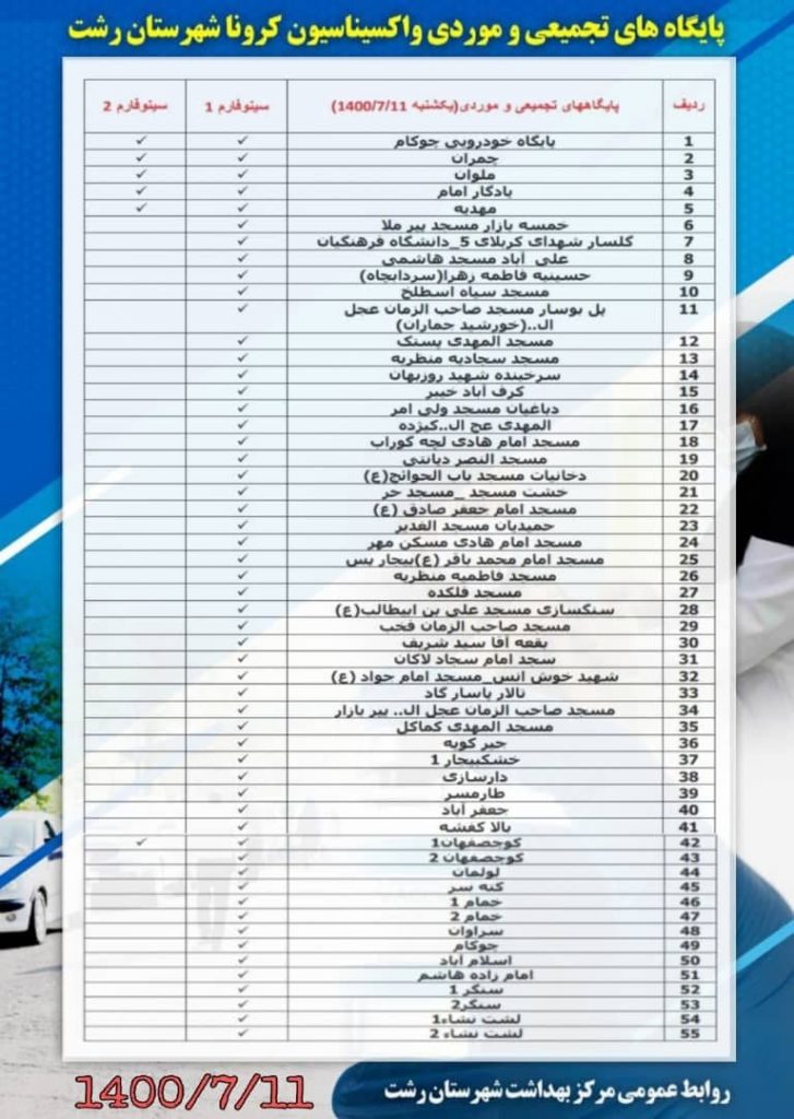 بر اساس این اطلاعیه، مردم شریف شهرستان رشت میتوانند در ۶ پایگاه هر دو دُز واکسن کرونا و در ۴۹ پایگاه دُز نخست واکسن کرونا را دریافت کنند.