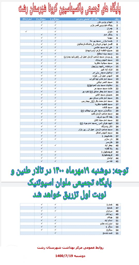 بر اساس این اطلاعیه، مردم شریف شهرستان رشت میتوانند در این پایگاهها واکسن سینوفارم ۱ و ۲، اسپوتنیک ۱ و آسترازنکا ۲ را تزریق کنند..