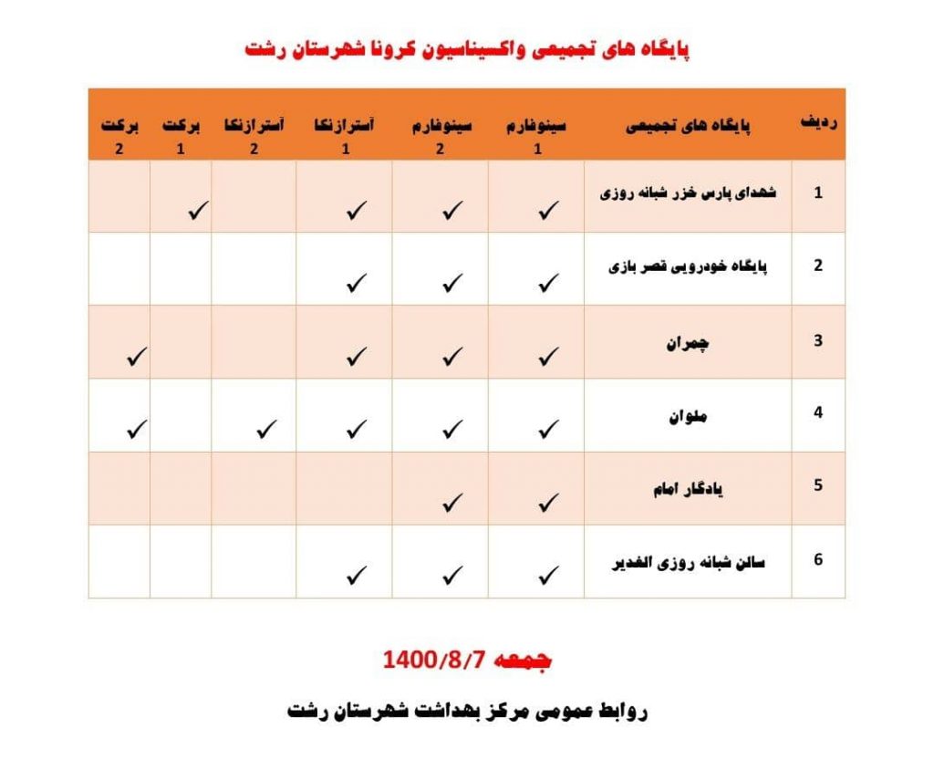 بر اساس این اطلاعیه، مردم شریف شهرستان رشت میتوانند در این پایگاهها واکسن سینوفارم ۱ و ۲، آسترازنکا ۱ و ۲ و برکت ۱ و ۲ را تزریق کنند.