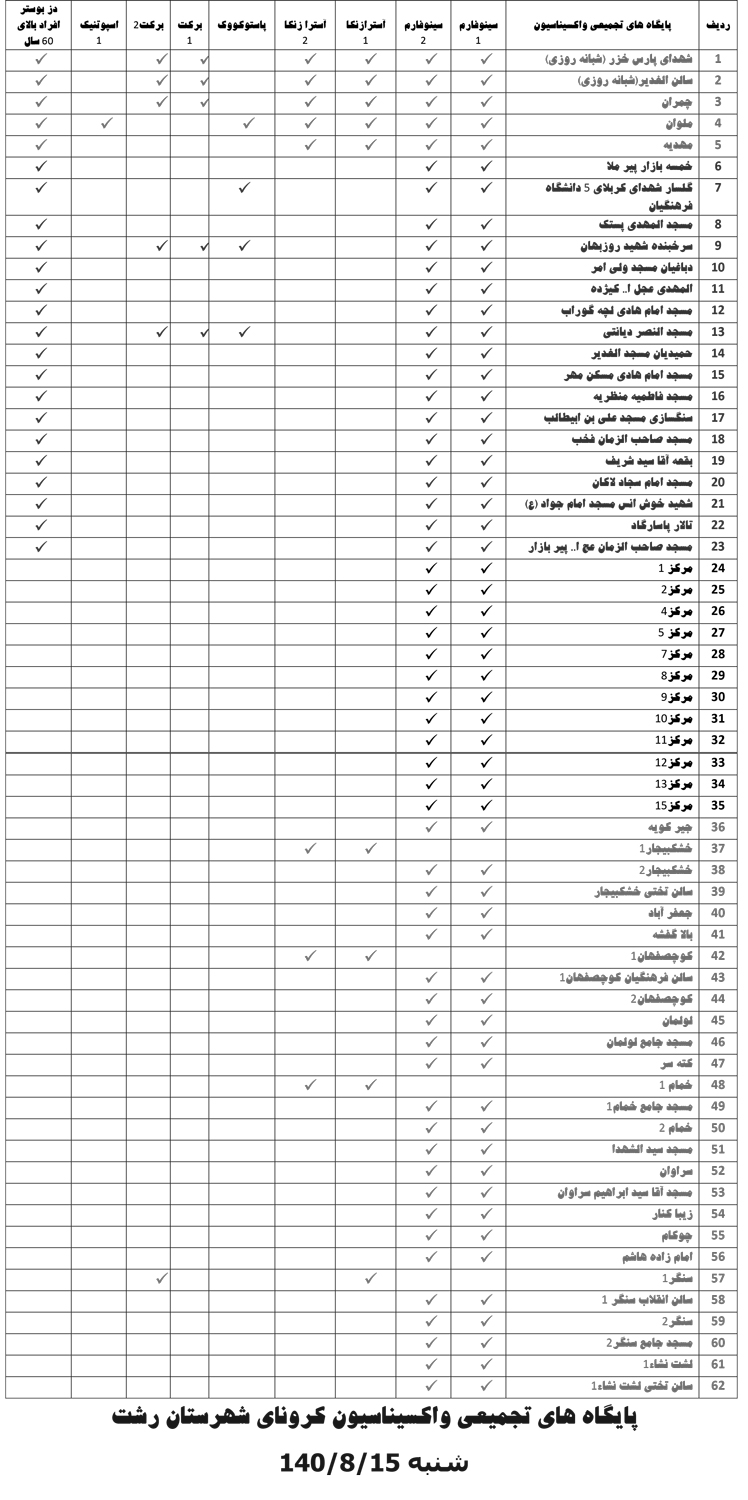 بر اساس این اطلاعیه، مردم شریف شهرستان رشت میتوانند در این پایگاهها واکسن سینوفارم ۱ و ۲، آسترازنکا ۱ و ۲، برکت ۱ و ۲، پاستو کووک ۱ و اسپوتنیک ۲ را تزریق کنند.