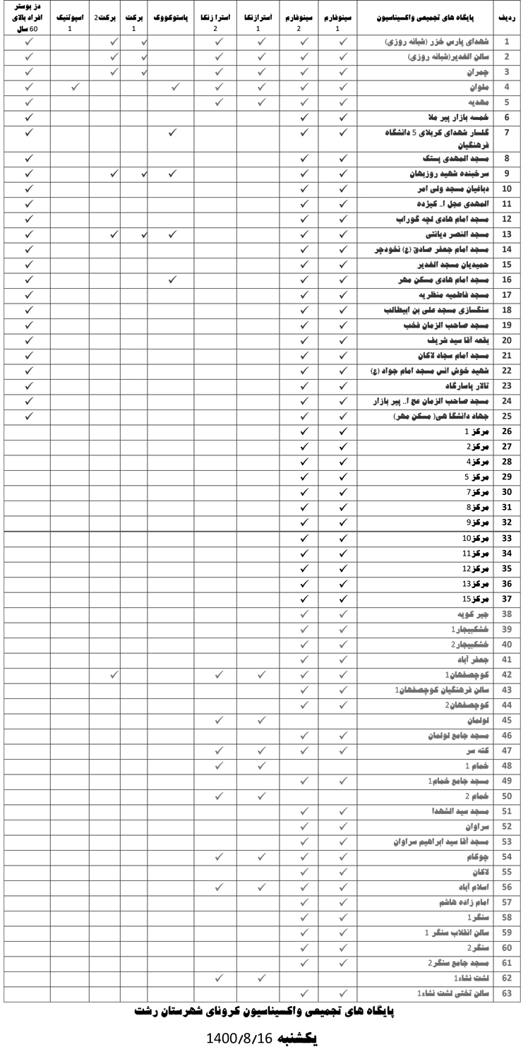 بر اساس این اطلاعیه، مردم شریف شهرستان رشت می‌توانند در این پایگاه‌ها واکسن سینوفارم ۱ و ۲، آسترازنکا ۱ و ۲، برکت ۱ و ۲، پاستو کووک ۱ و اسپوتنیک ۱ را تزریق کنند.
