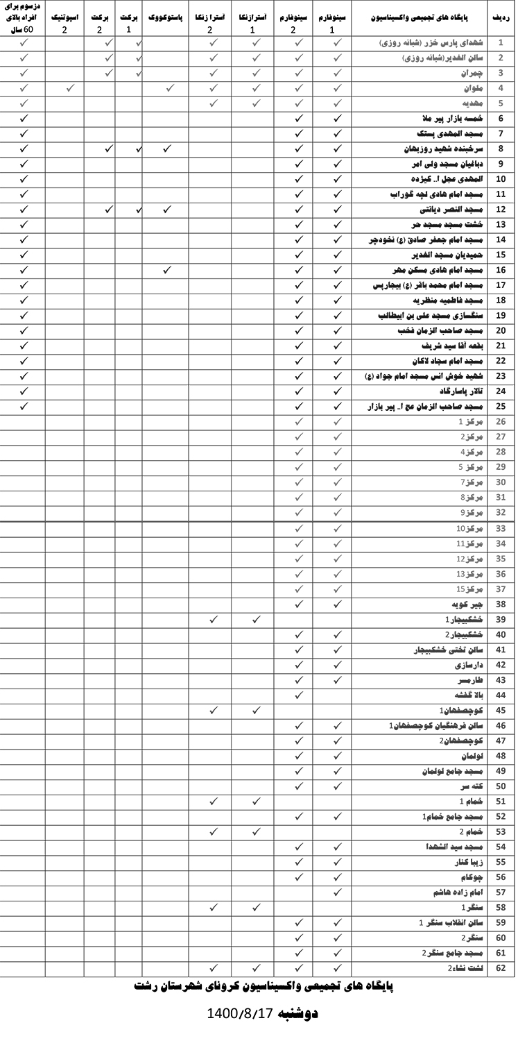 بر اساس این اطلاعیه، مردم شریف شهرستان رشت میتوانند در این پایگاهها واکسن سینوفارم ۱ و ۲، آسترازنکا ۱ و ۲، برکت ۱ و ۲، پاستو کووک ۱ و اسپوتنیک ۲ را تزریق کنند.