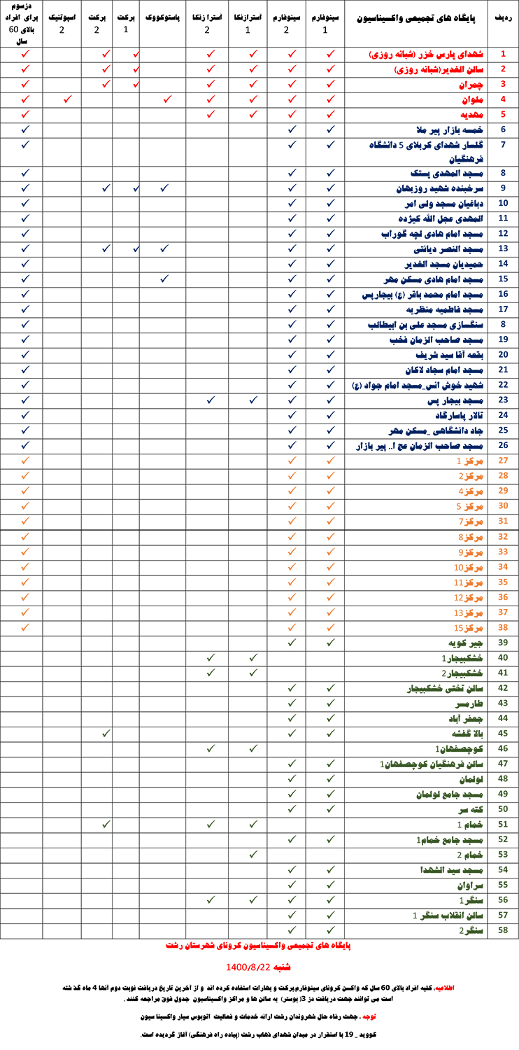 گفتنی است، همچنین کلیه افراد بالای ۶۰ سال که واکسن کرونای سینوفارم، برکت و بهارات استفاده کردهاند و از آخرین تاریخ ردیافت نوبت دوم آنها، ۴ ماه گذشته است، میتوانند جهت دریافت دُز ۳ (بوستر) به سالنها و مراکز واکسیناسیون جدول زیر مراجعه کنند.