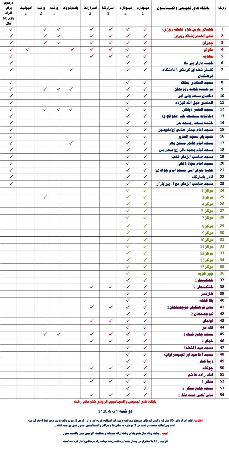 گفتنی است، همچنین کلیه افراد بالای ۶۰ سال که واکسن کرونای سینوفارم، برکت و بهارات استفاده کرده‌اند و از آخرین تاریخ ردیافت نوبت دوم آنها، ۴ ماه گذشته است، می‌توانند جهت دریافت دُز ۳ (بوستر) به سالن‌ها و مراکز واکسیناسیون جدول زیر مراجعه کنند.
