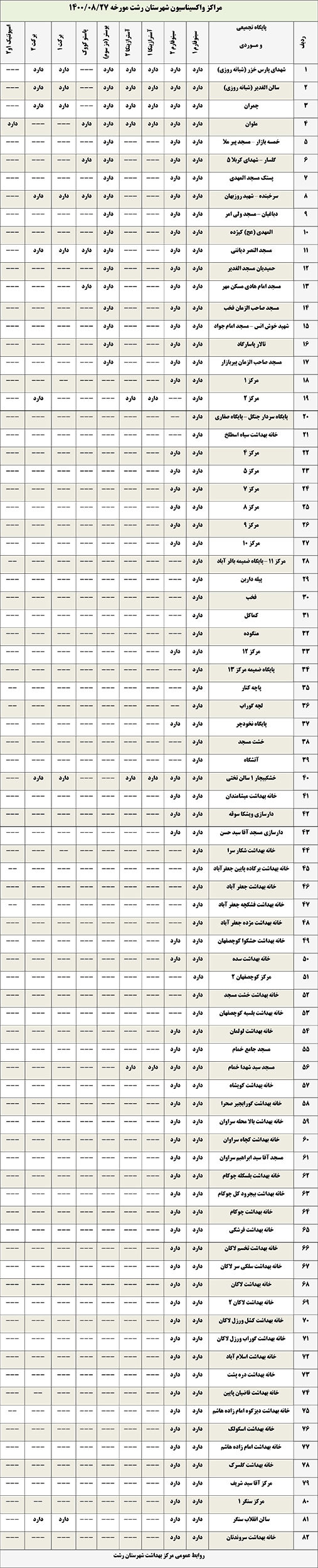 فهرست 82 پایگاه‌ تجمیعی و موردی واکسیناسیون کرونا شهرستان رشت برای روز پنجشنبه (27 آبان ۱۴۰۰) اعلام شد.