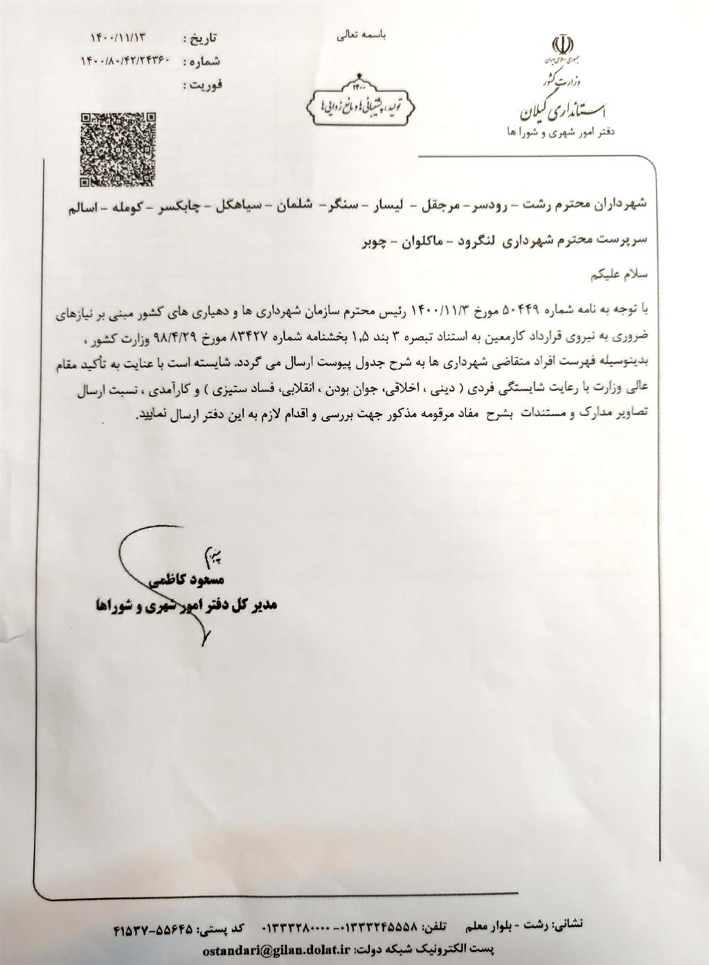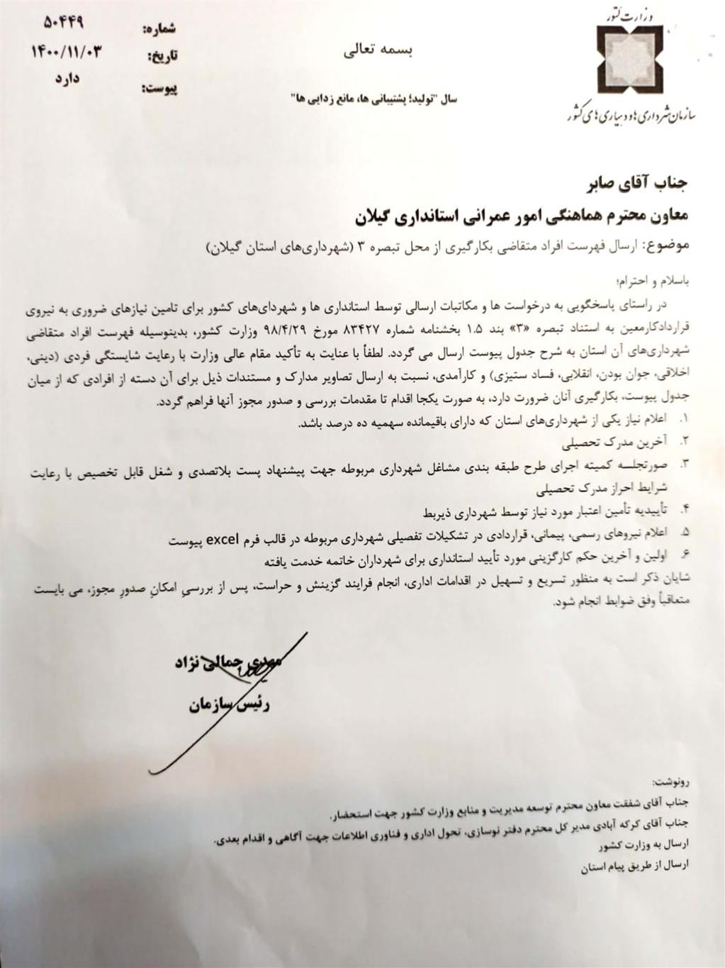 لازم به ذکر است، پاسخ شهردار رشت با توجه به عدم ظرفیت ده درصدی تبصره ۳ بند ۱.۵ بخشنامه شماره ۸۳۴۲۷ مورخ ۹۸/۴/۲۹ وزارت کشور، صرفا جهت کسب ارائه طریق با نحوه اقدام و عمل در خصوص نامبردگان در پاسخ به درخواست رئیس سازمان دهیاریها و شهرداریهای کشور، همچنین مدیرکل دفتر امور شهری و شوراها تهیه گردیده است و شامل هیچگونه جذب نیرو در شهرداری تلقی نمیگردد.